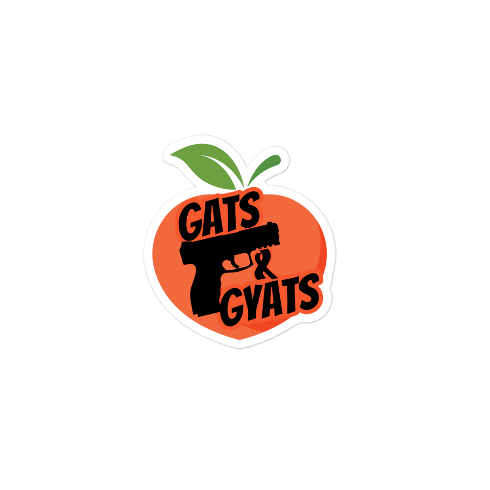 A vinyl sticker featuring a peach with a handgun placed overtop, accompanied by the words Gats And Gyats. Bitches love stickers. This sheet measures 3x3 inches.