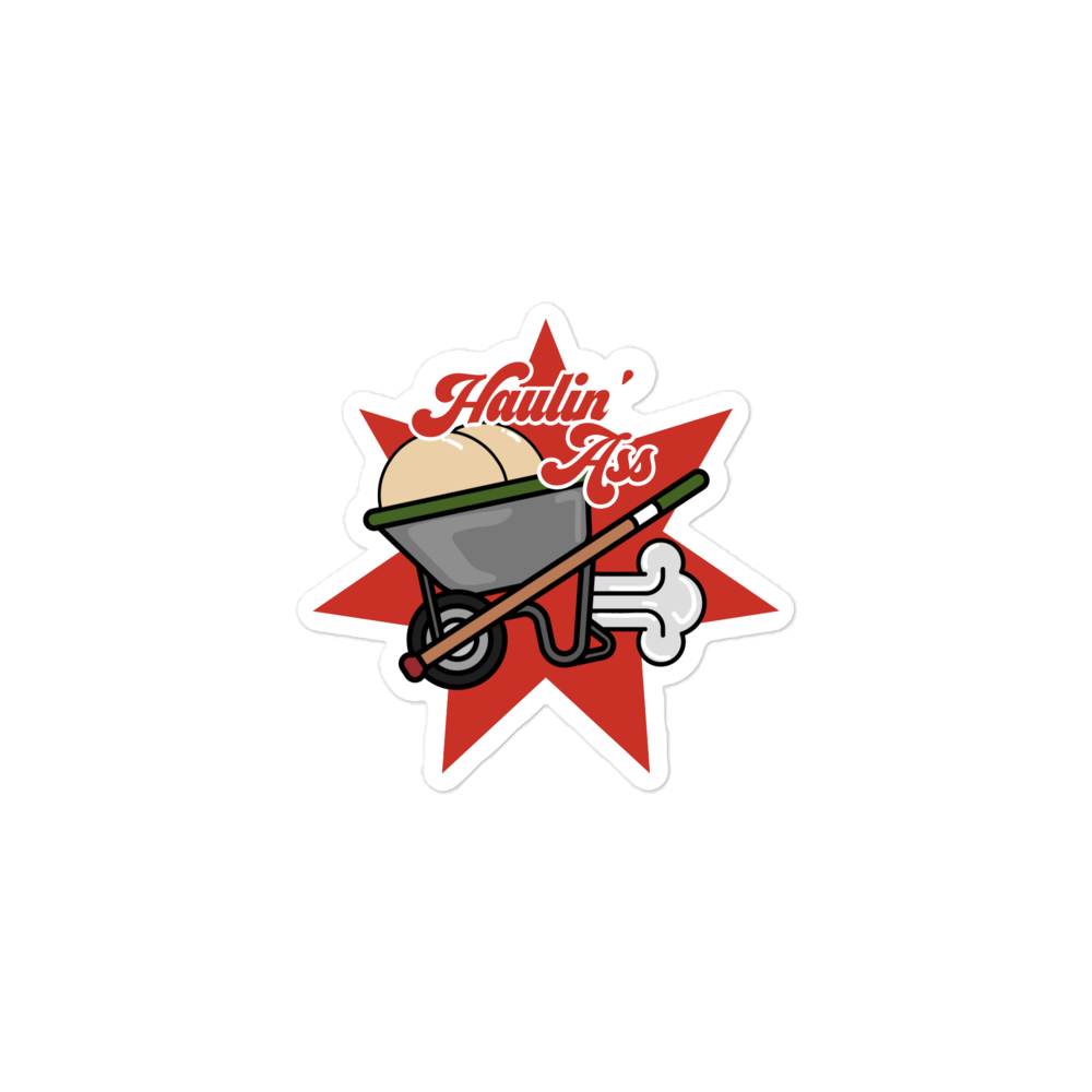 A vinyl sticker with a wheelbarrow carrying some juicy asscheeks overtop of a red star. The design is accompanied by the words Haulin' Ass. Clever as fuck, aren't I?
