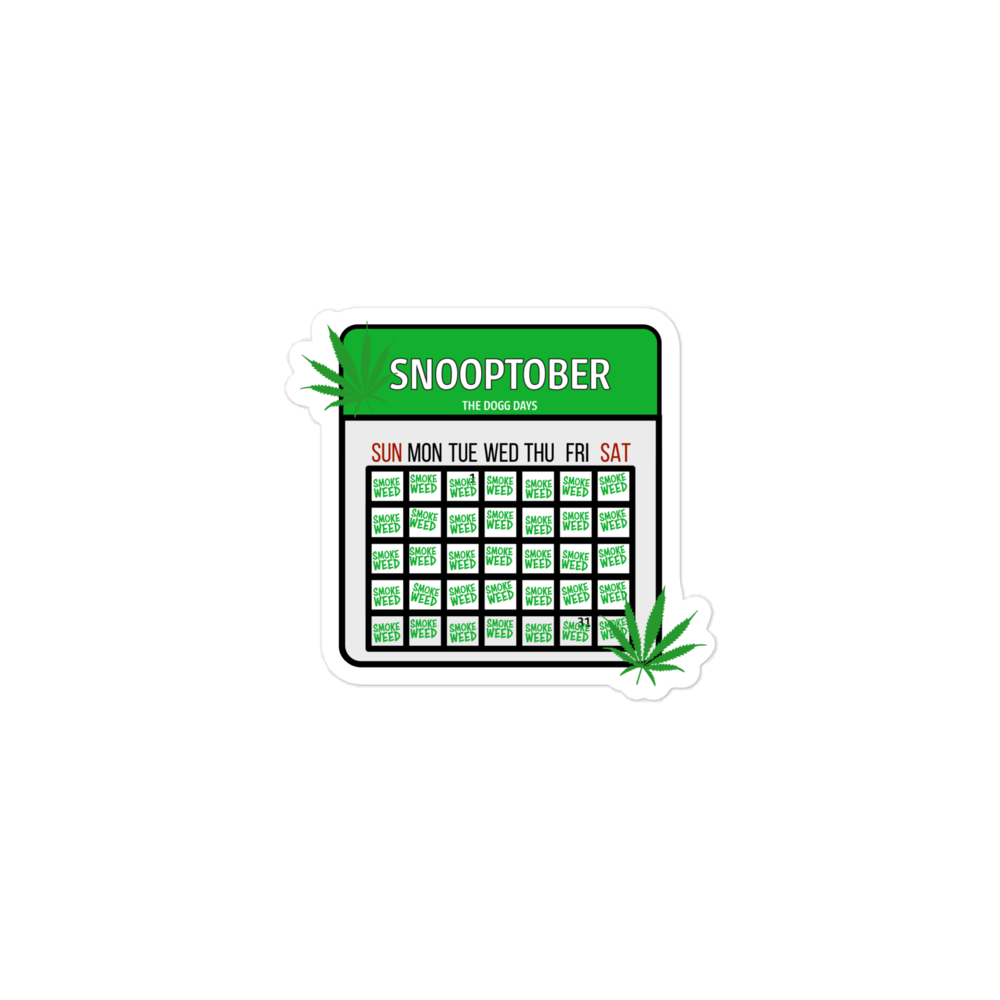 A vinyl sticker with a calendar labeled Snooptober, with every date scheduled for Smoking Weed. I can't pass up obvious jokes. This sticker sheet measures 3"x3".