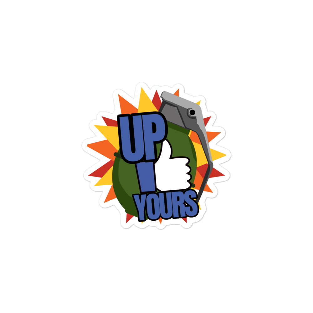 A vinyl sticker featuring a grenade with a "Like" button along with the words Up Yours, over top of a cartoon explosion. Everyone gets on my nerves, so I think I'm gonna start handing these out to people. This sticker sheet measures 3"x3".