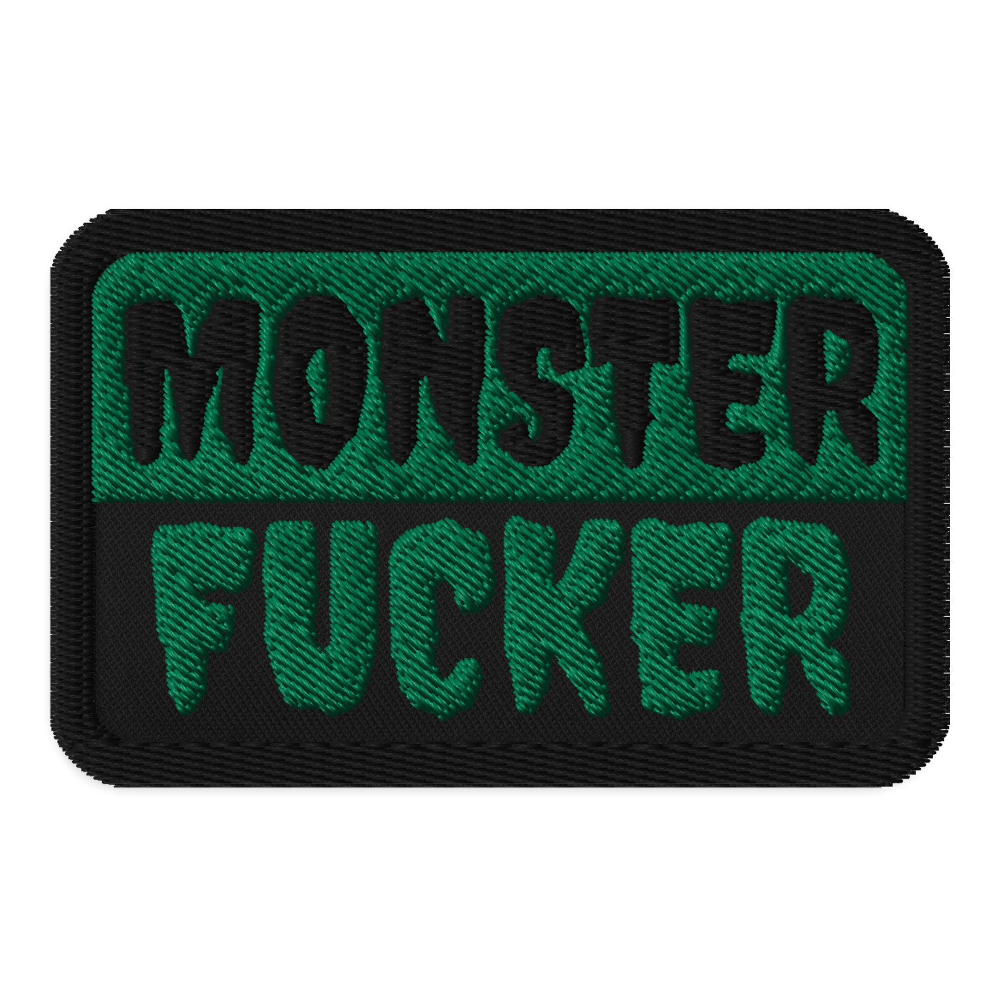 An embroidered patch featuring the words Monster Fucker over a green and black background. I just know someone is going to end up asking for it before Halloween gets here, so I went ahead and did it. You fucking degenerates.