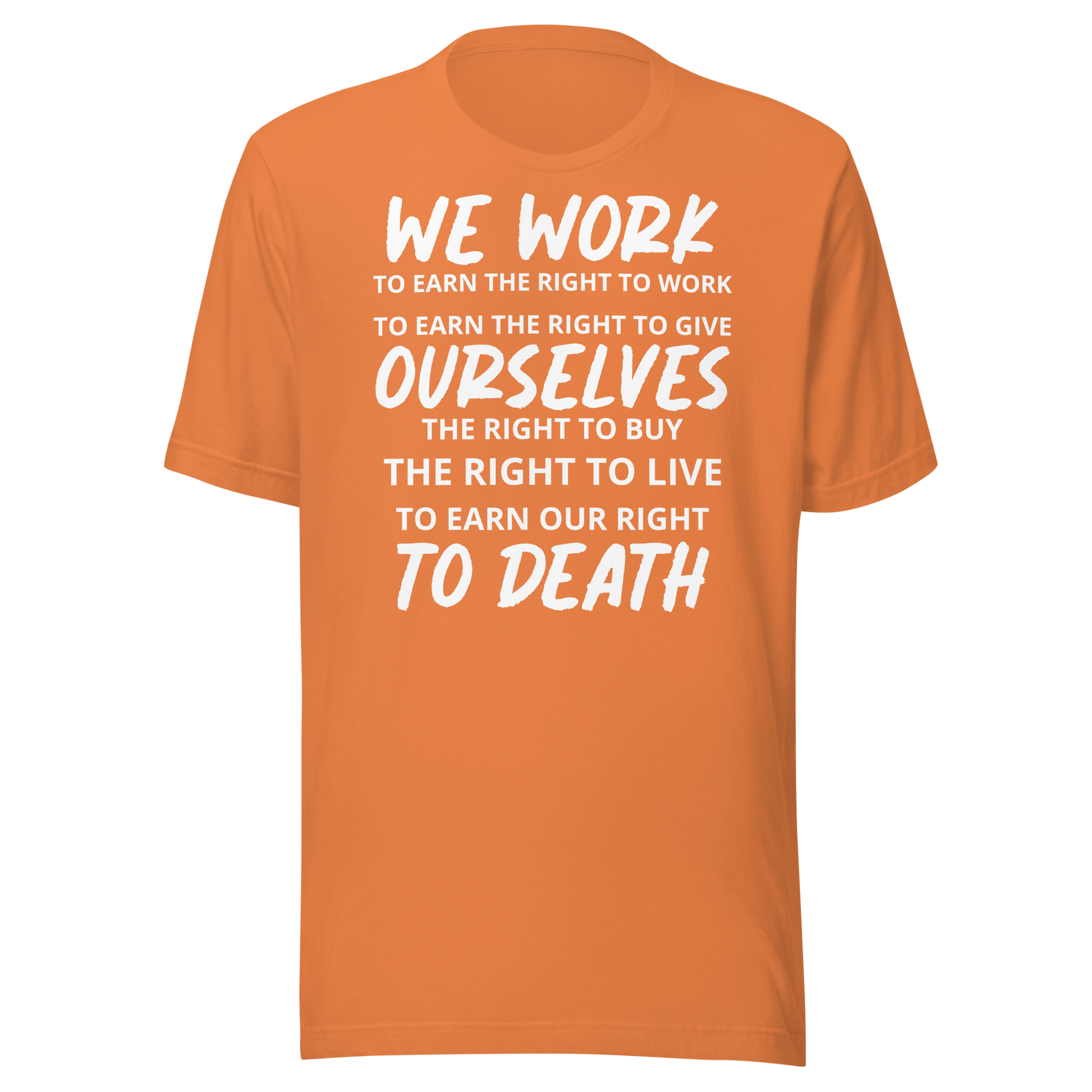 A shirt featuring a modified version of the lyrics to the Outer Worlds' theme song "The Fine Print" by The Stupendium. They want us to work so we can make their stuff. They want us to sell the stuff we make for them, and then also buy it. They tell you to buy these things so that way you can live in this world they've sold you. All to work your fingers to the bones and be another day deeper in debt. You make thousands of dollars worth of product every hour, but take home less than a hundred. It's unfair, and they know it. It's why the spend so much money to keep you from unionizing, voting third-party, or going on strike and demanding what you are worth. Get organized, workers. Your enemy has already done so.