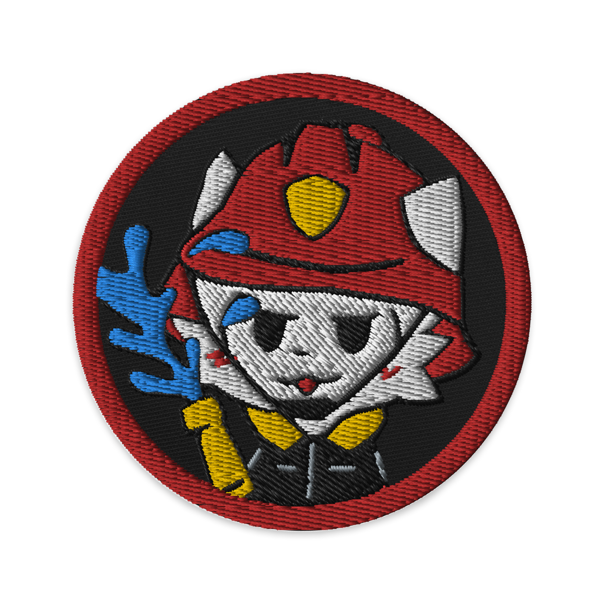 An embroidered patch featuring that god damned fucking cat, this time dressed up as a fireman, getting all wet from the hose spray. Giggity.