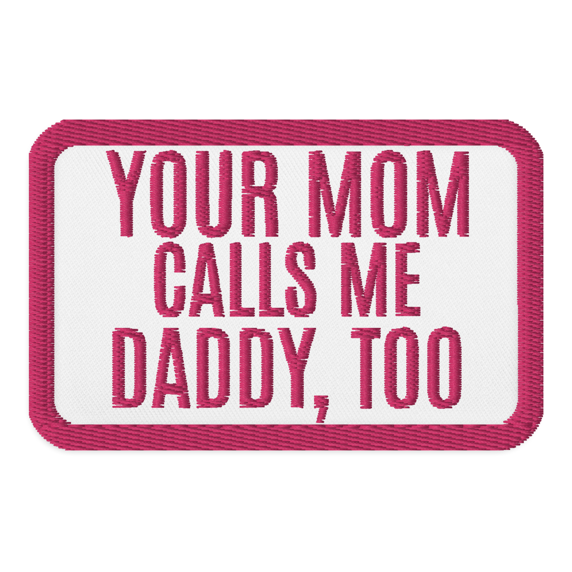 An embroidered patch featuring the words Your Mom Calls Me Daddy, Too. Whether you want this bad boy because you're kinky, a parent, or because you're out of ideas for Father's Day- I've got you covered.