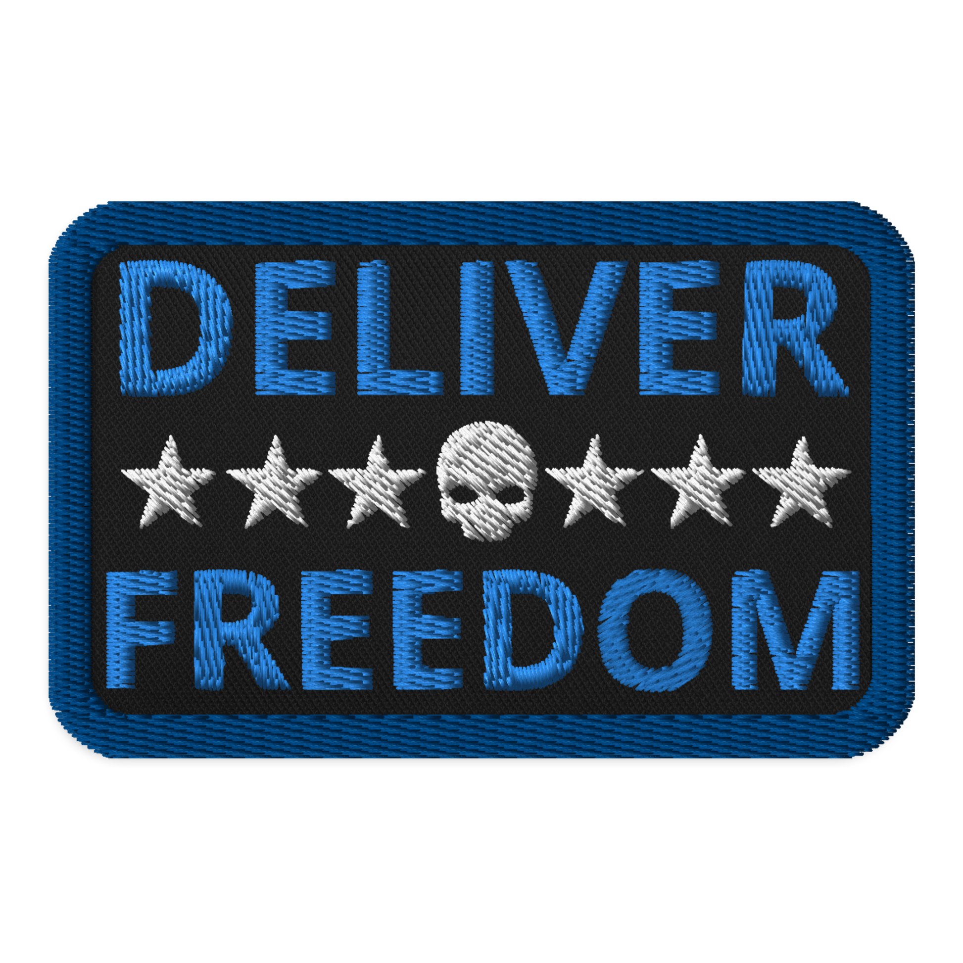 An embroidered patch featuring the words Deliver Freedom, along with a skull and some stars. Another parody patch for the Super Earth Government in Helldivers 2.