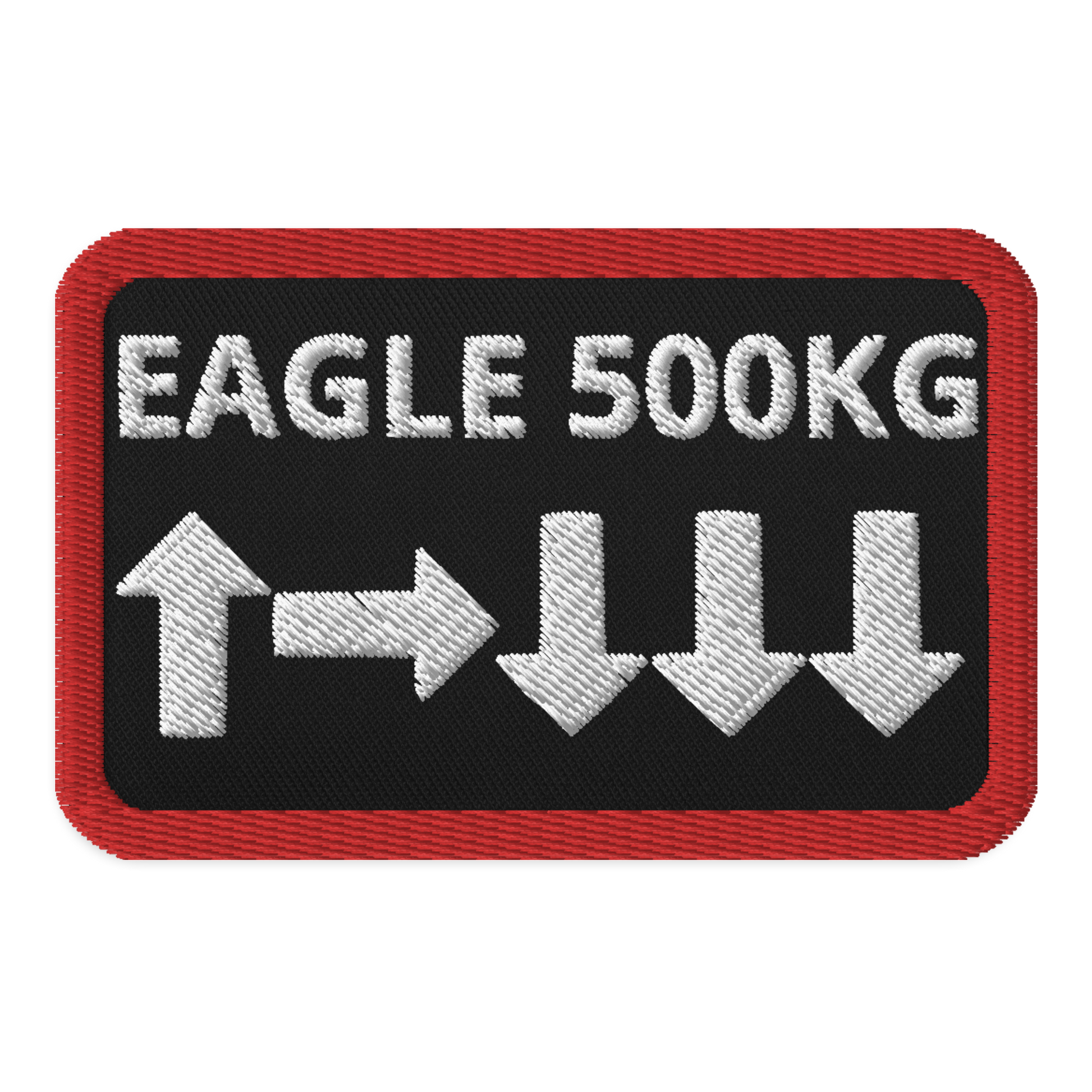 An embroidered patch featuring the Stratagem input code for the 500 kilogram bomb delivered by the Eagle strike craft in Helldivers 2. A hell of a dose of democracy in a compact package.