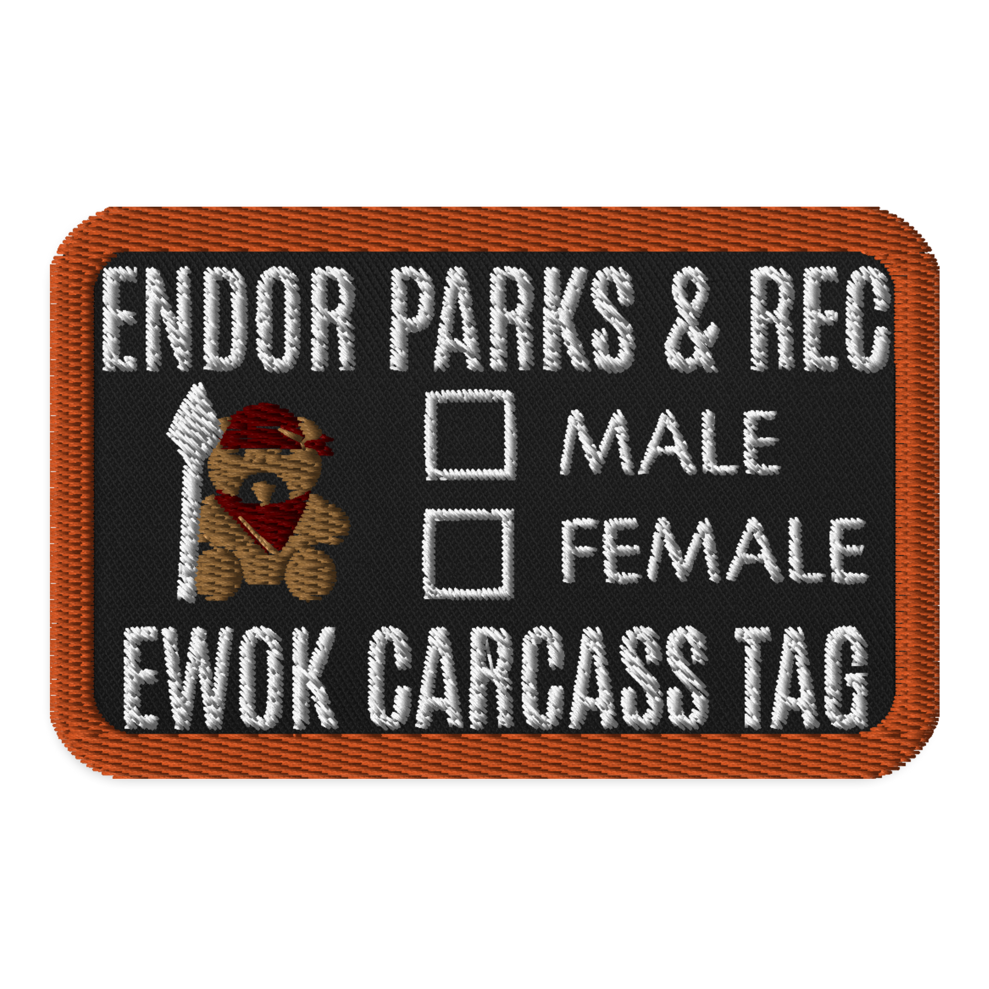 An embroidered patch featuring the words Endor Parks and Rec, as well as Ewok Carcass Tag, reminiscent of a hunting tag.