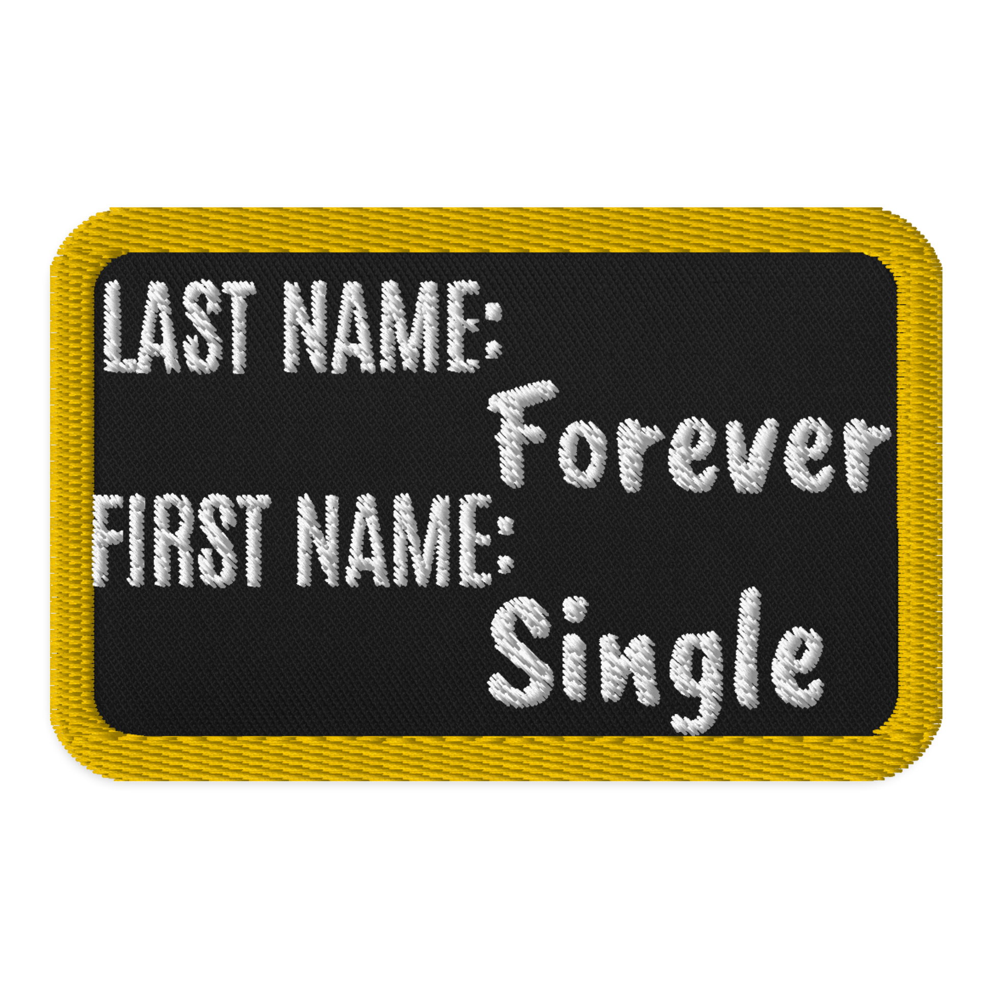 An embroidered patch featuring the words First Name: Single Last Name: Forever
