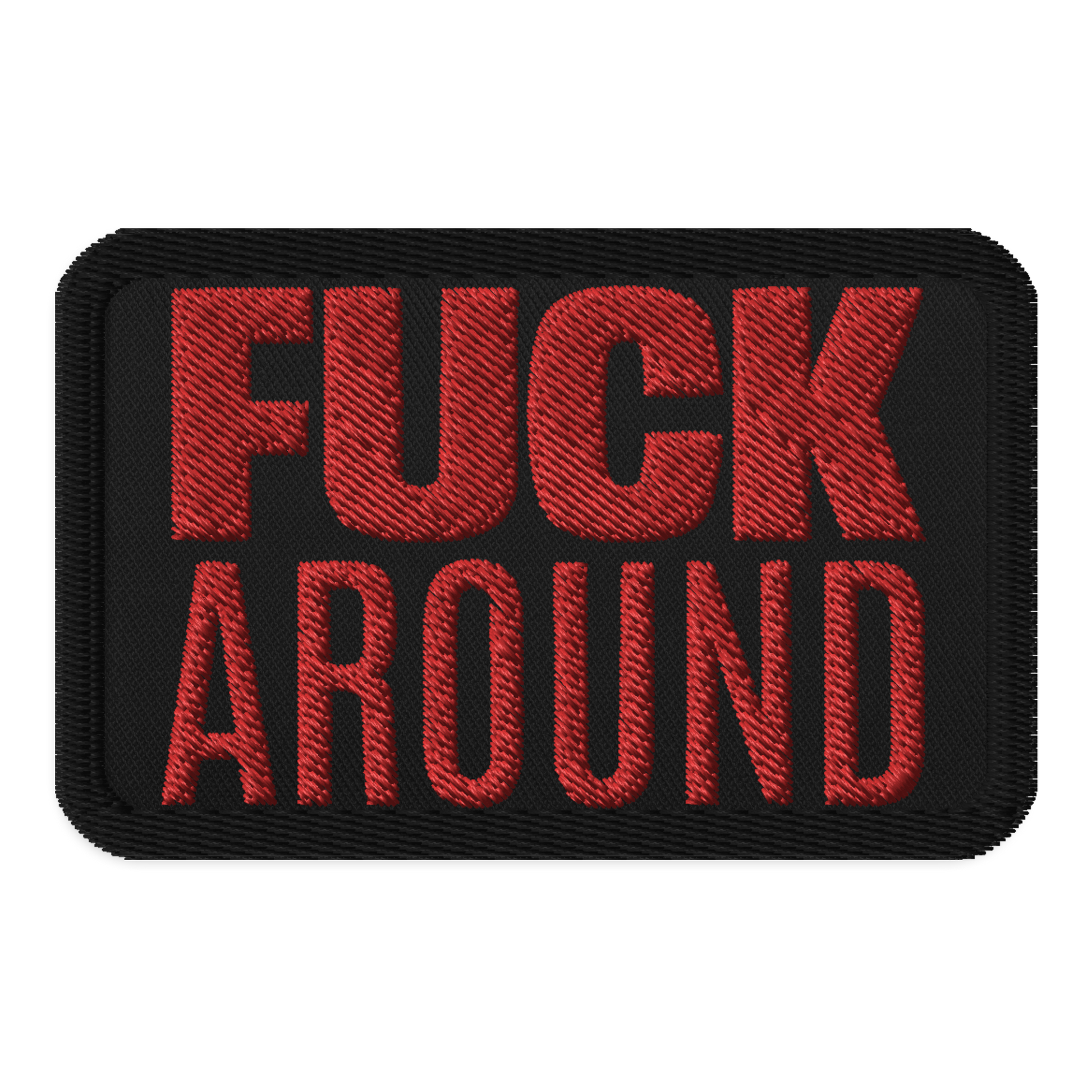 An embroidered patch featuring the words Fuck Around. Go on then, do it. We're fucking waiting. Go on ahead, fuck around, buddy. I fucking dare you. I double dog dare you, motherfucker. Come on then, we fuckin' around today or what? Well, I don't got time to fuck around.