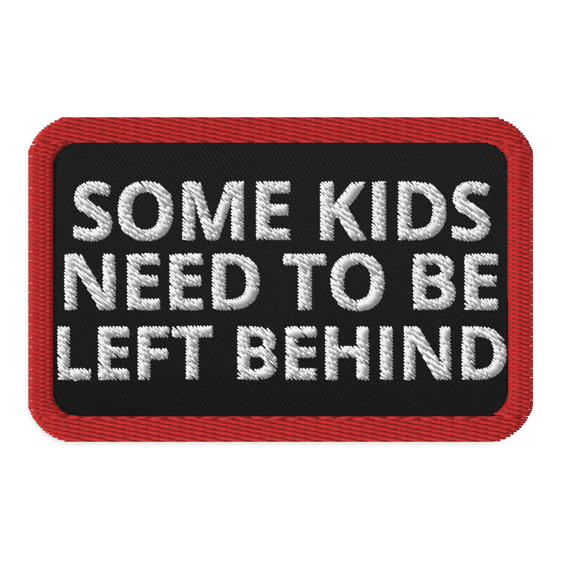 An embroidered patch featuring the words Some Kids Need to Be Left Behind, a reference to the ol' George W. Bush era of educational changes. I would love for every kid to get the attention and support they need to make it in the world and to be a competent adult. But a lot of motherfuckers lack reading comprehension, critical thinking, introspective, and general manners. There's a reason the literature teacher asked you about the door being red. There's a reason you're supposed to be able to identify themes in literature, and refer to sources in scientific texts. The system has made slaves and fools of the population, and now they can't even teach themselves what the system refuses to. How can you expect this generation of kids to be better than their parents, grandparents, when the previous generation failed to ensure that was the case themselves? Weak men create hard times, and hard times can create strong men. But more often, it just makes weaker people.
