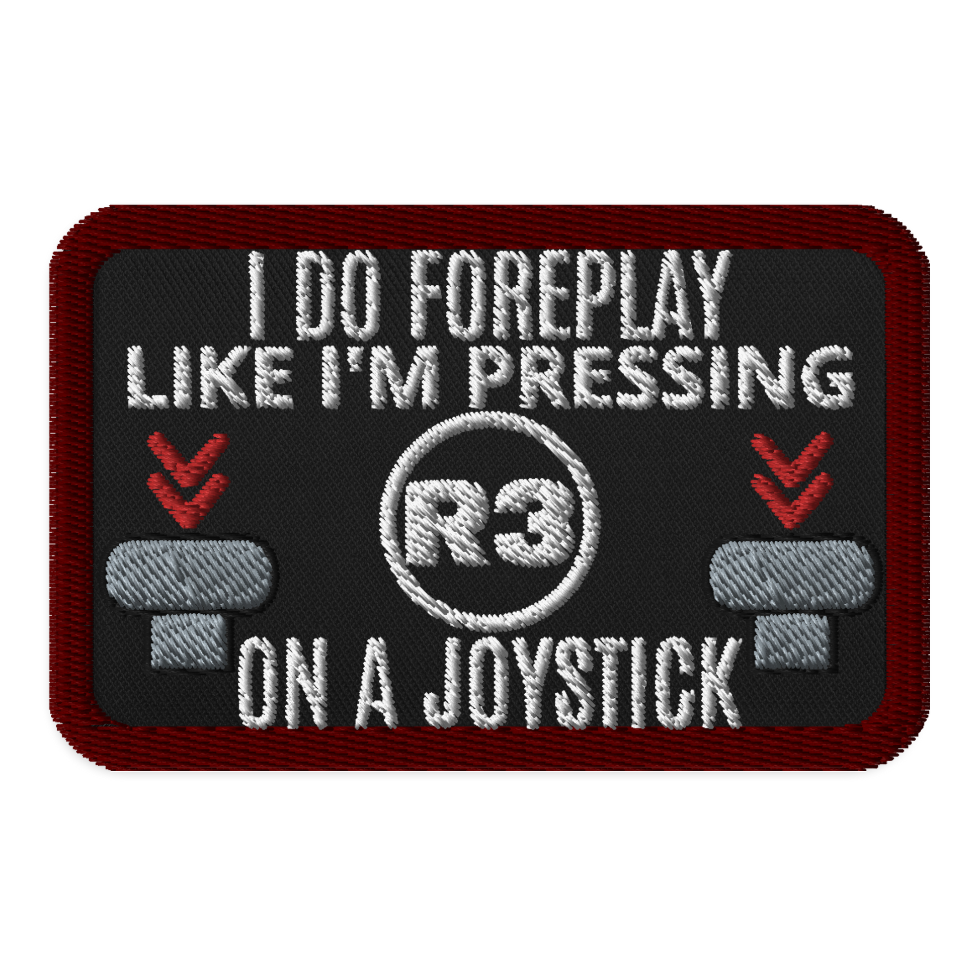 An embroidered patch featuring the words I Do Foreplay Like I'm Pressing R3 On A Joystick. I'm old enough to remember when the first PlayStation came out and the motherfucker didn't have the joysticks, just the directional pad and the classic button configuration. Then they had the joysticks, which made racing and action games way easier. But then one day, out of nowhere, games started telling you to use "R3". It was every man's first g-spot if they were born 1988-1997. Thank god I managed to find both.
