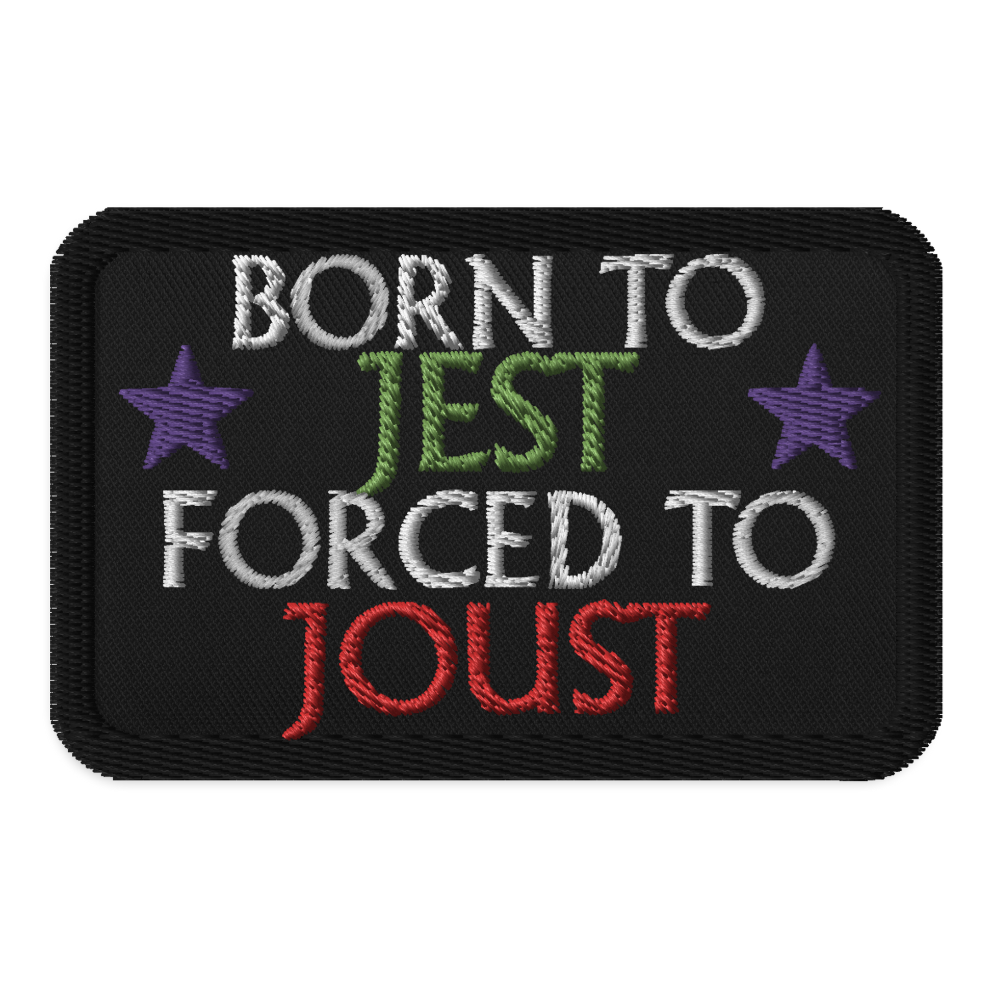 An embroidered patch featuring the words Born to Jest, Forced to Joust in white, red, and green letters, accompanied by two purple stars. Another classic rendition of the "Born to-, Forced to-" format, this one is just a bit Arthurian. Born to fuck around, forced to find out.