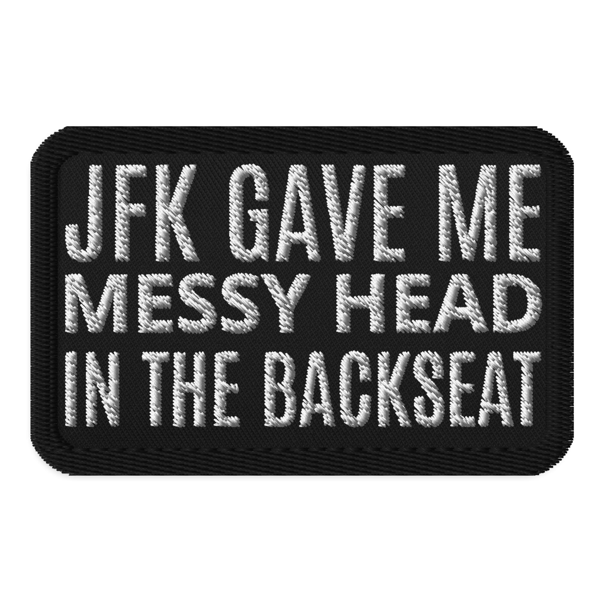 An embroidered patch featuring the words JFK Gave Me Messy Head In The Backseat. You know what I'm sayin'?