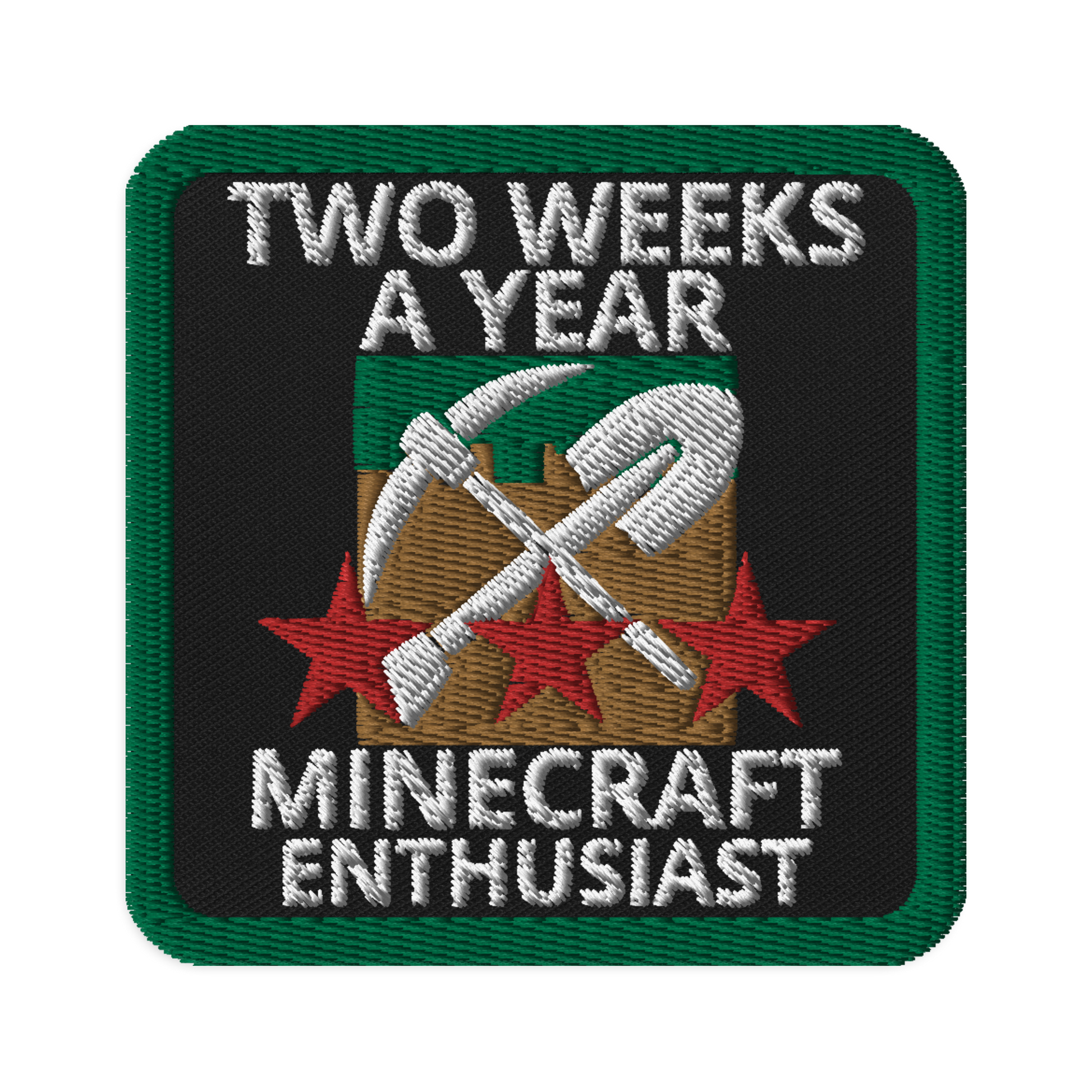 An embroidered patch featuring the words Two Weeks A Year Minecraft Enthusiast, along with a grassblock bearing a pickaxe and a shovel. It happens to all of us. We just get this urge to start up another Minecraft world with our friends- go hard on it for a little while- and then go back to doing other stuff. Until next year.