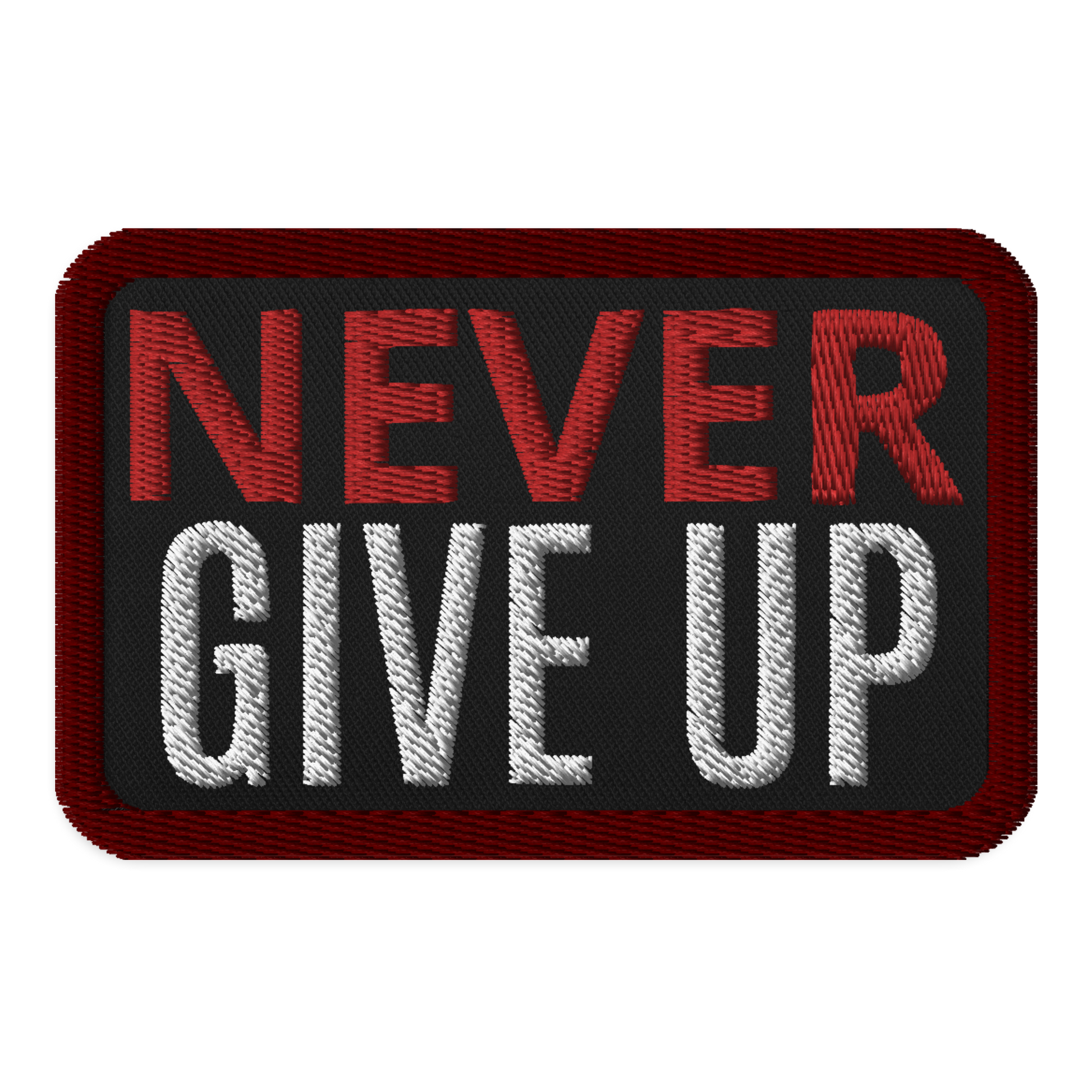 An embroidered patch featuring the words Never Give Up. While it's close to me Rick Rolling you, it's not quite that. Just the rest of that Nick Eh 30 "Never Back Down" shit. But yeah, never give up. Really good advice.