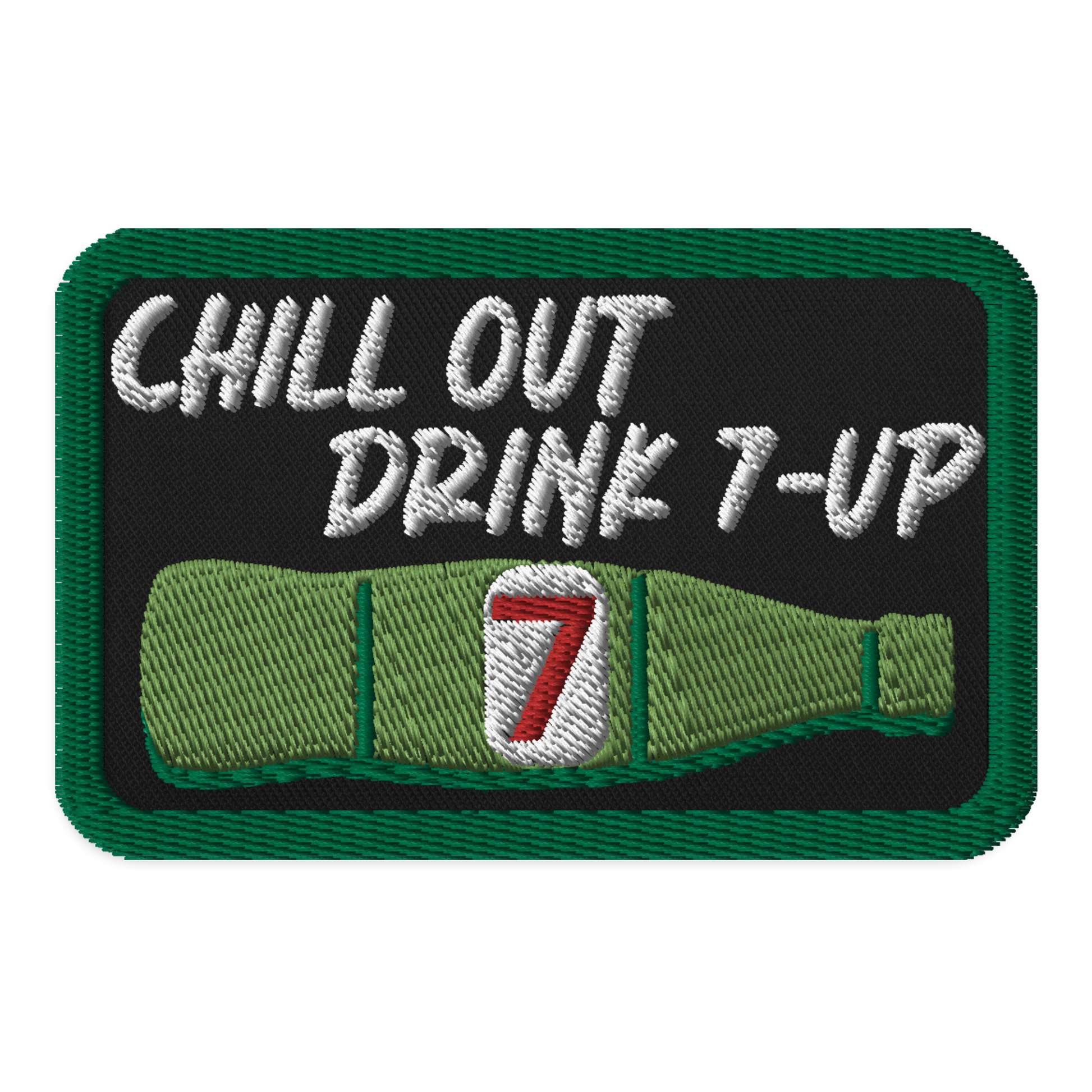 An embroidered patch featuring the words Chill Out, Drink 7-Up along with a green soda bottle.