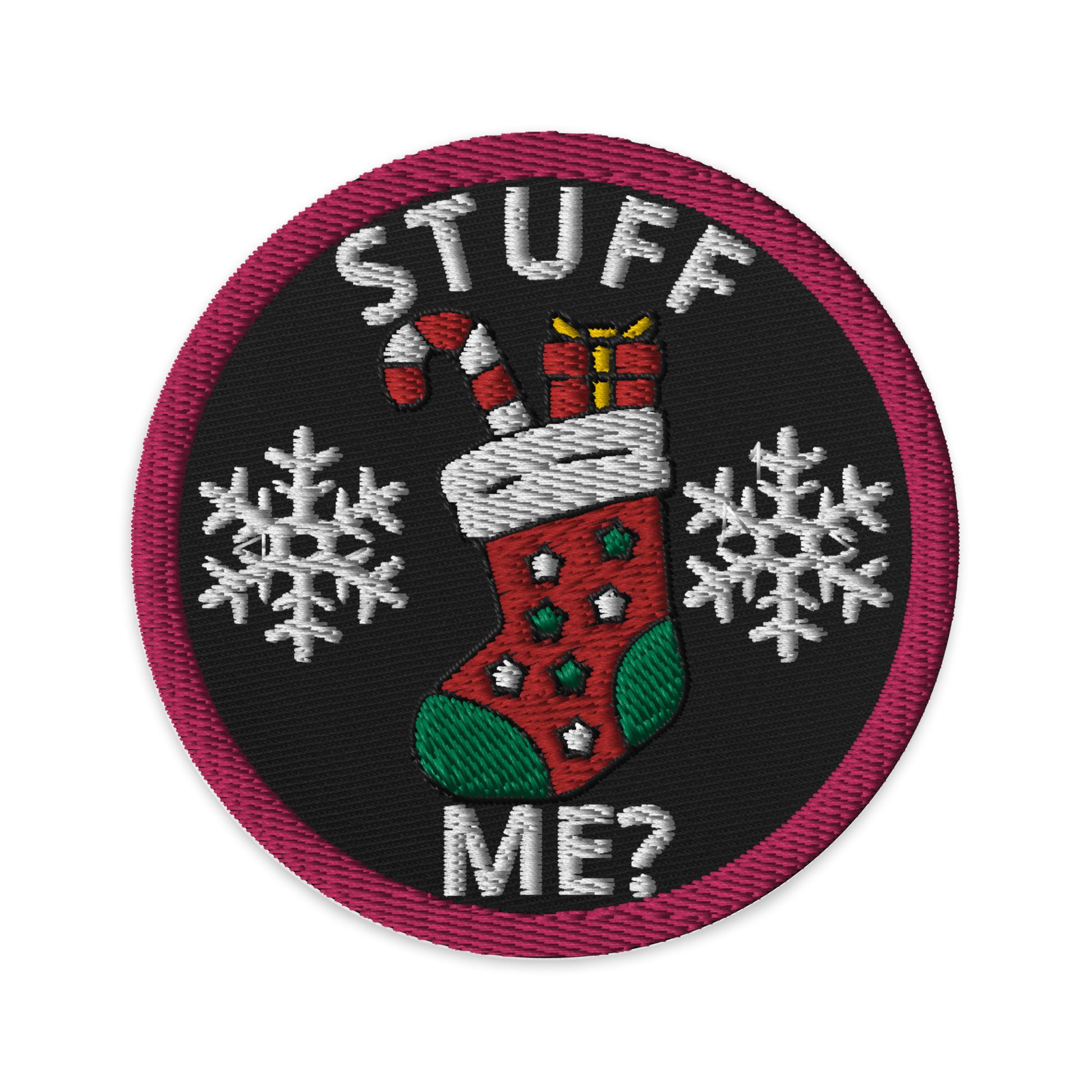 An embroidered patch featuring the words Stuff Me? along with a Christmas stocking. Is it going to be a White Christmas for you and yours?