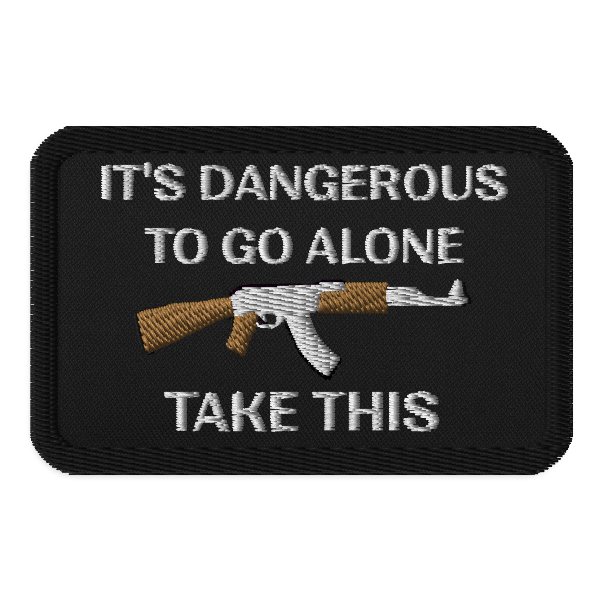 An embroidered patch featuring an AK pattern rifle with the famous Legend of Zelda quote "It's dangerous to go alone. Take this."
