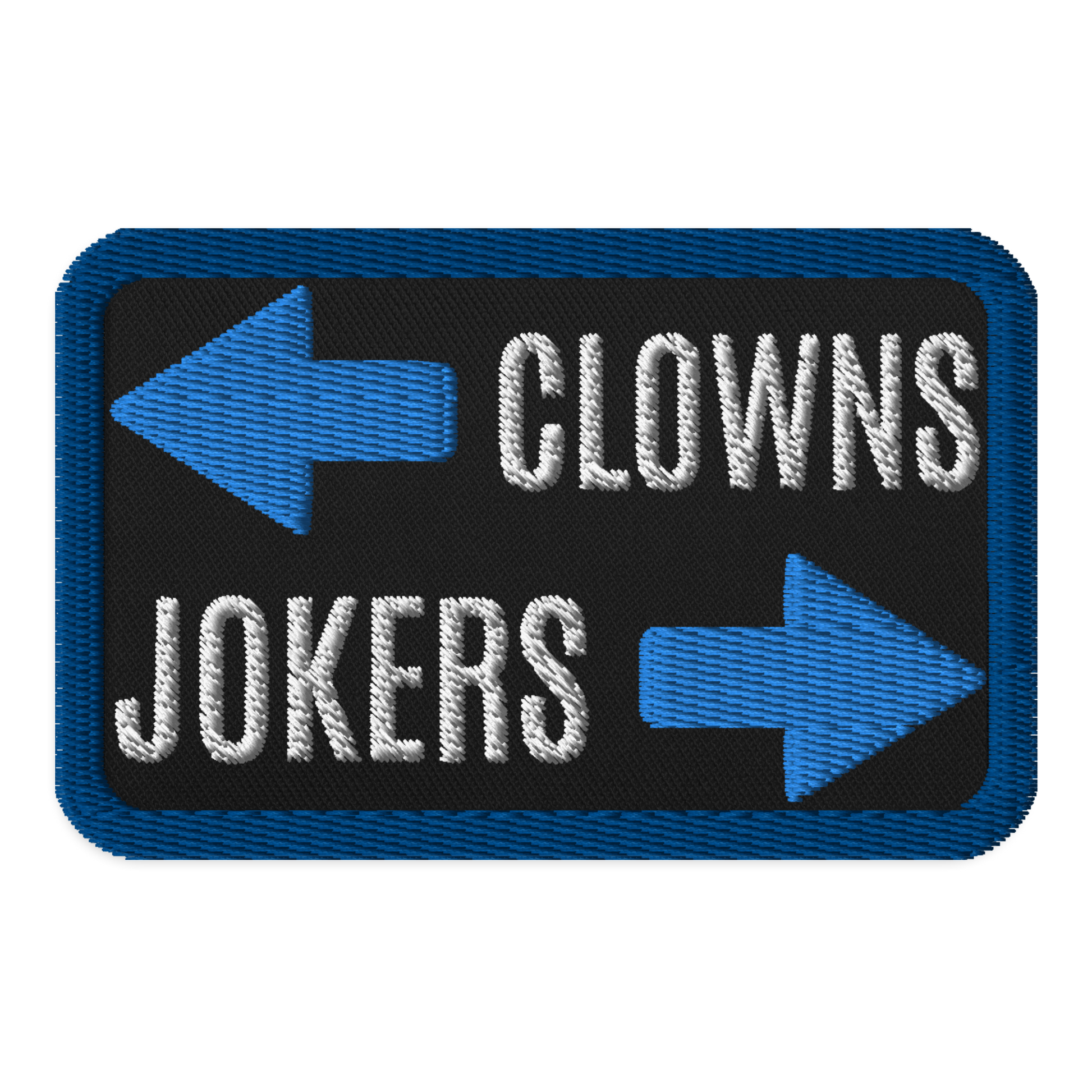 An embroidered patch featuring arrows and the words Clowns and Jokers. Clearly a reference to a pretty damn good song.