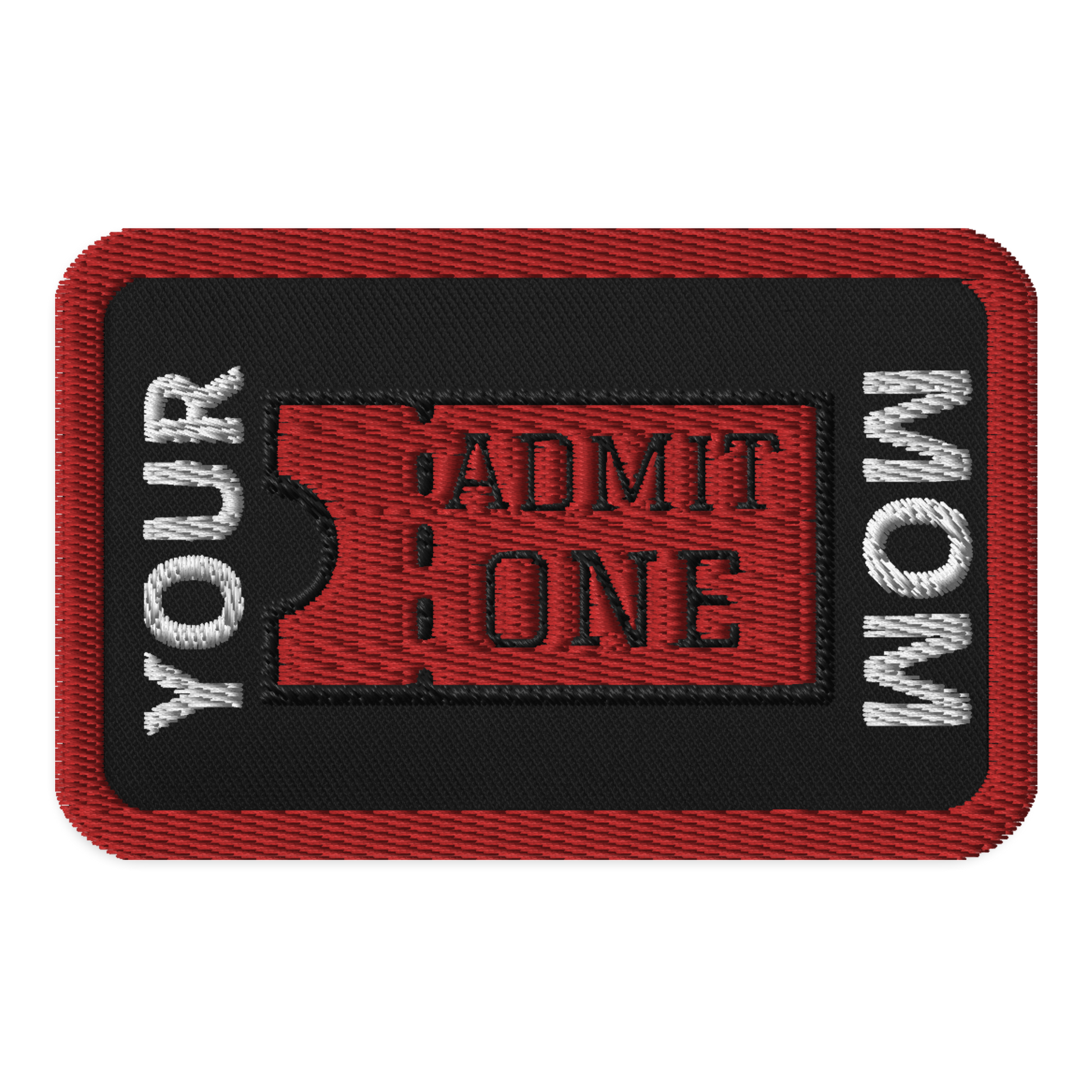 An embroidered patch featuring the words Admit One on a red ticket to Your Mom. Tickets are selling fast, get them while you can!