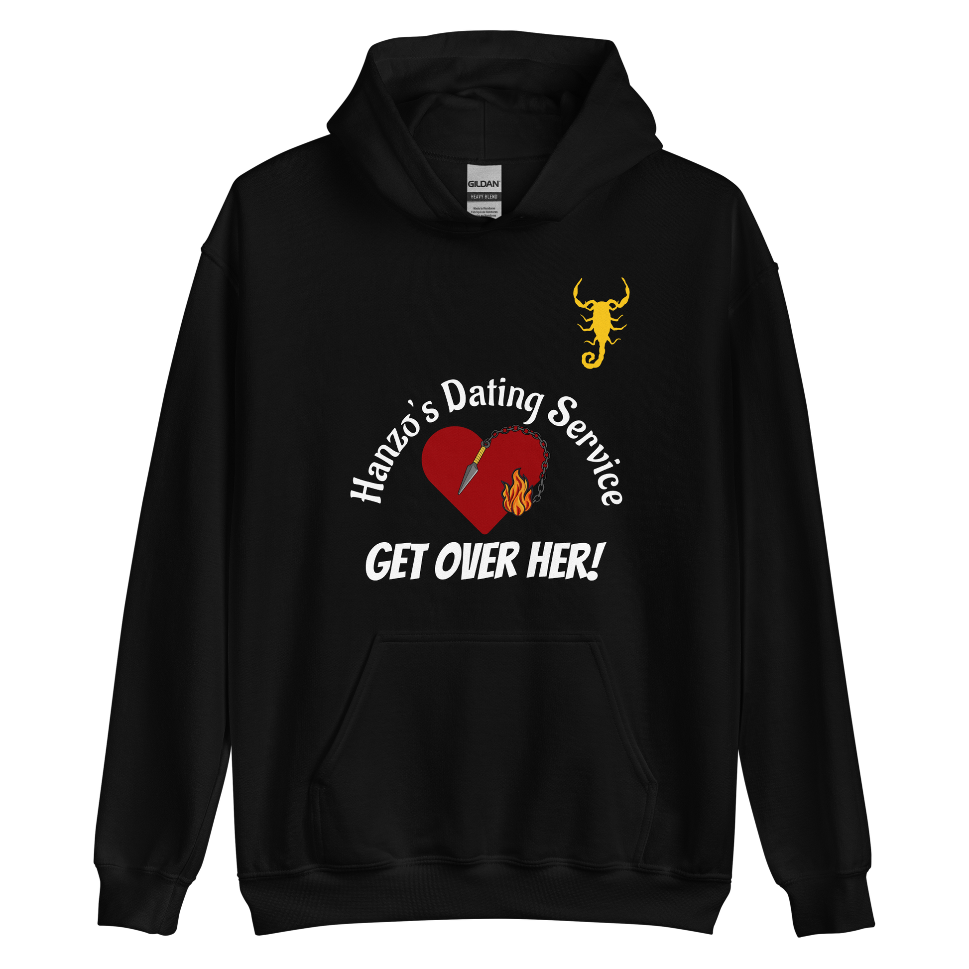 A hooded sweatshirt featuring a yellow scorpion on the breast, along with a heart and a flaming kunai rope dart as utilized by Scorpion/Hanzo Hasashi in the Mortal Kombat franchise of video games. Get Over Her! is a play on his classic taunt of "Get over here!" from when he'd hit enemies with this rope dart.