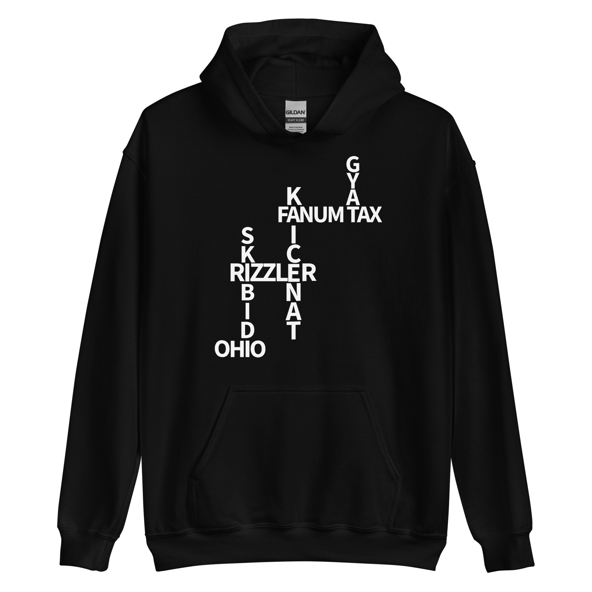 A hooded sweatshirt featuring the words Gyat, Fanum Tax, Kai Cenat, Skibidi, Rizzler, and Ohio. I really don't get this newest trend, but I live by the phrase "carpe diem". So, here's another bandwagon I am jumping on.